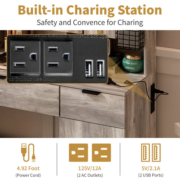 4. Convenient Charging Station with USB Ports: The built-in power strip includes 2 standard plug sockets and 2 USB ports, making it easy to charge your devices or use your hair dryer and curling iron while seated at your vanity.